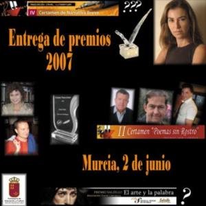 Estamos ya a punto de conocer los finalistas del IV Certamen de Narrativa Breve y preparando la KDD- Cena entrega de premios que será en el 2 de junio del 2007 en Murcia. Se entregarán los premios a los tres ganadores, diploma a los finalistas, y los premios especiales: PREMIO DEL PUBLICO Y PREMIO ESPECIAL SALZILLO. También los premios a los ganadores del II Certamen «Poemas sin Rostro»